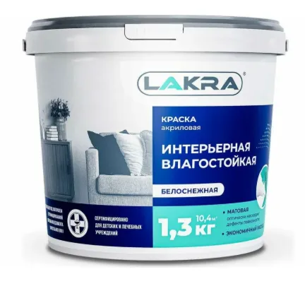 —Краска ВД интерьерная влагостойкая супербелая 1,3кг ЛАКРА