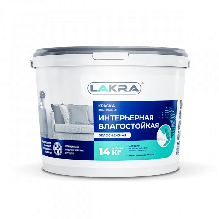 —Краска ВД интерьерная влагостойкая супербелая 14кг ЛАКРА